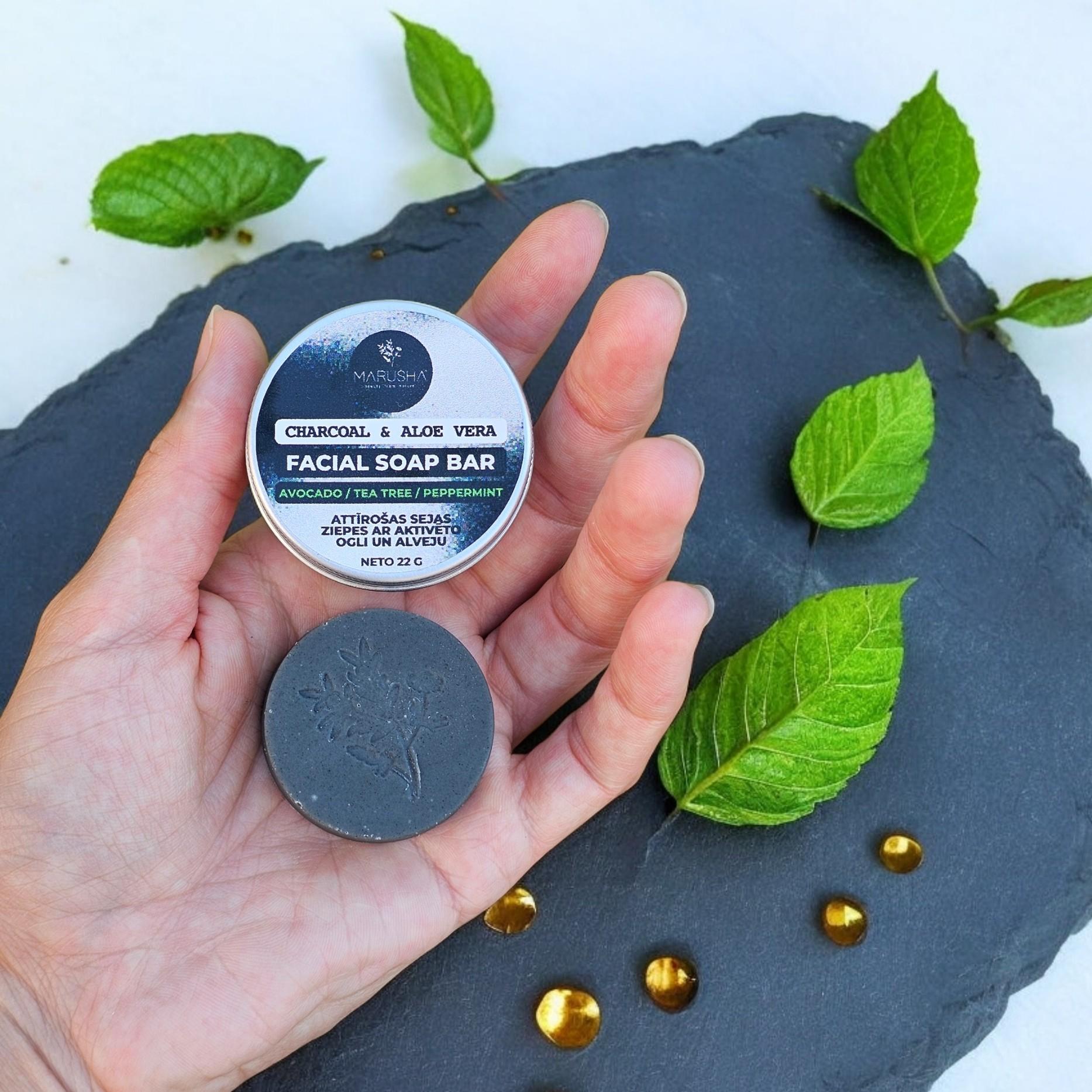 Dabīgās ziepes sejas mazgāšanai satur aktīvos komponentus - Aktivētā ogle, Alveja, Avokado eļļa, kakao un šī sviests, Tējas koka un Piparmētras ēteriskās eļļas, kas maigi attīra ādu un saglabā ādas dabisko aizsargslāni.