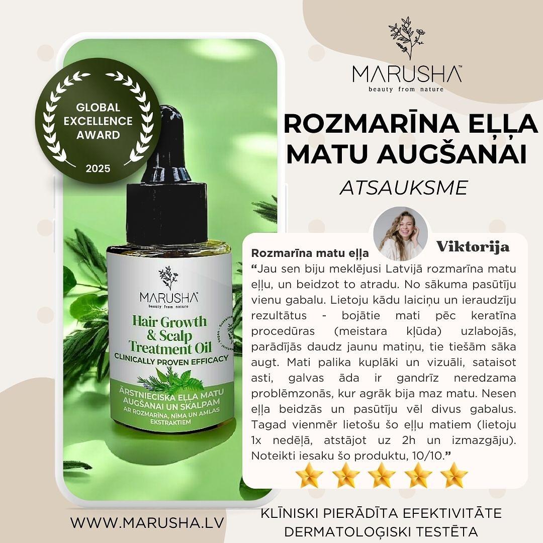 Pateicoties šīs ārstnieciskās matu eļļas dabiskajam sastāvam un atjaunojošajai iedarbībai, MARUSHA ir saņēmusi "Global Excellence Awards 2025" apbalvojumu "Labākie dabiskās un ilgtspējīgās ķermeņa kopšanas atjaunojošie produkti 2025".