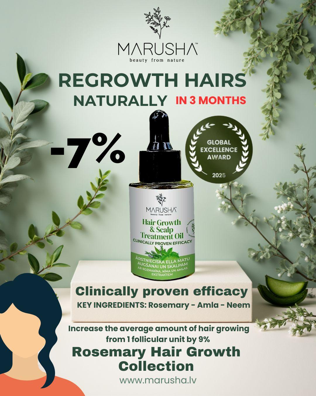 MARUSHA Ārstnieciskā Matu eļļa augšanai, saskaņā ar klīniskiem pētījumiem, palielina matu skaitu un blīvumu, pabaro, atdzīvina un mitrina matus, matu saknes un galvas ādu, kā arī novērš blaugznas.