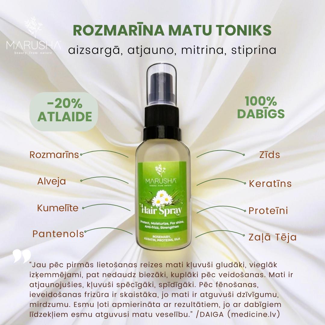 Natural Hair Spray water consists from Rosemary, Aloe Vera, Chamomile, Green Tea, Vege Collagen, Proteins, Keratin, Silk Proteins (Silk Amino Acids) and Panthenol.