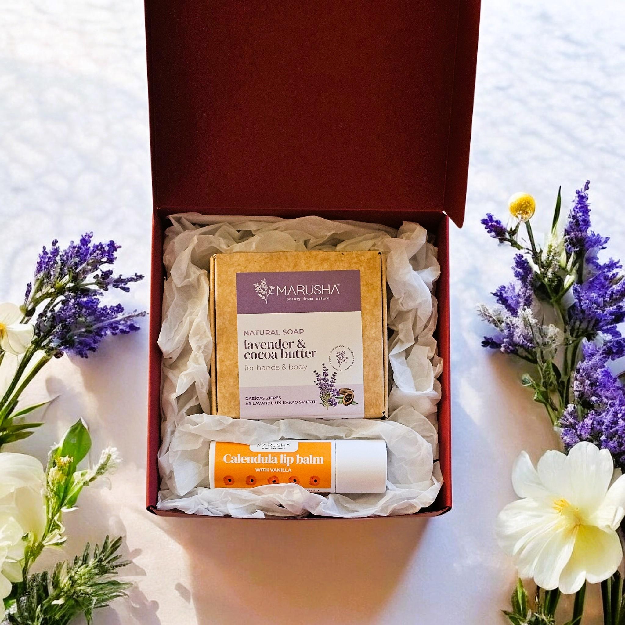 • MARUSHA natural cosmetic gift set - Calendula Lip balm and Natural Soap (Lavender or Linden Blossom Soap Bar).