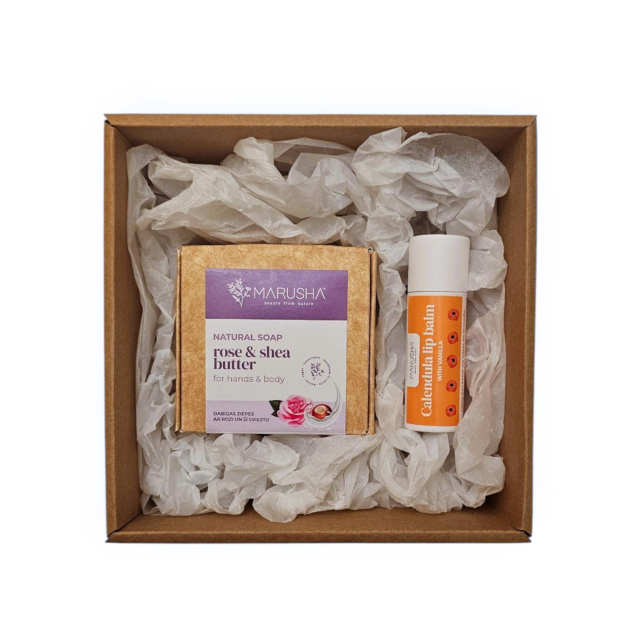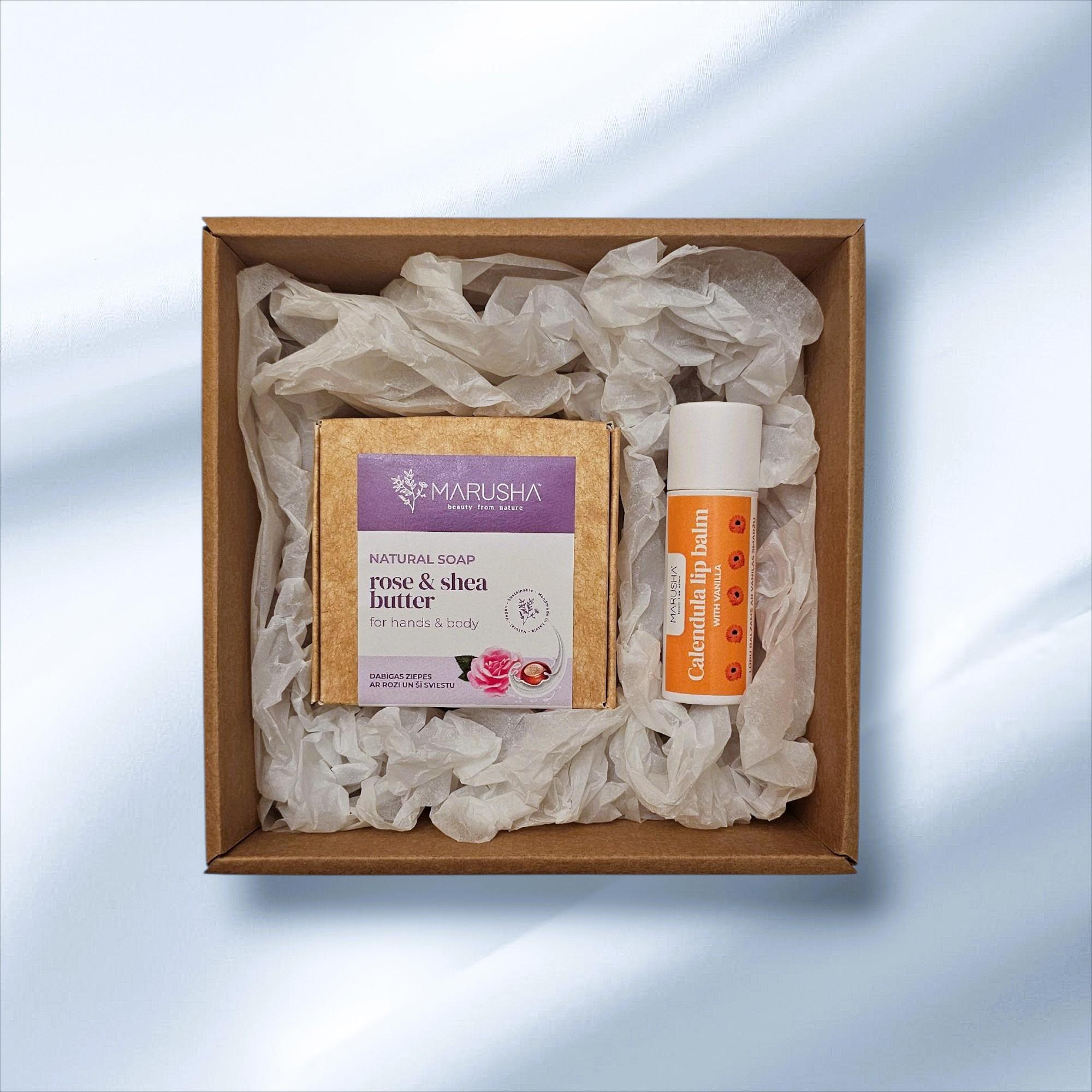 MARUSHA natural cosmetic gift set - Calendula Lip balm and Natural Soap ROSE.