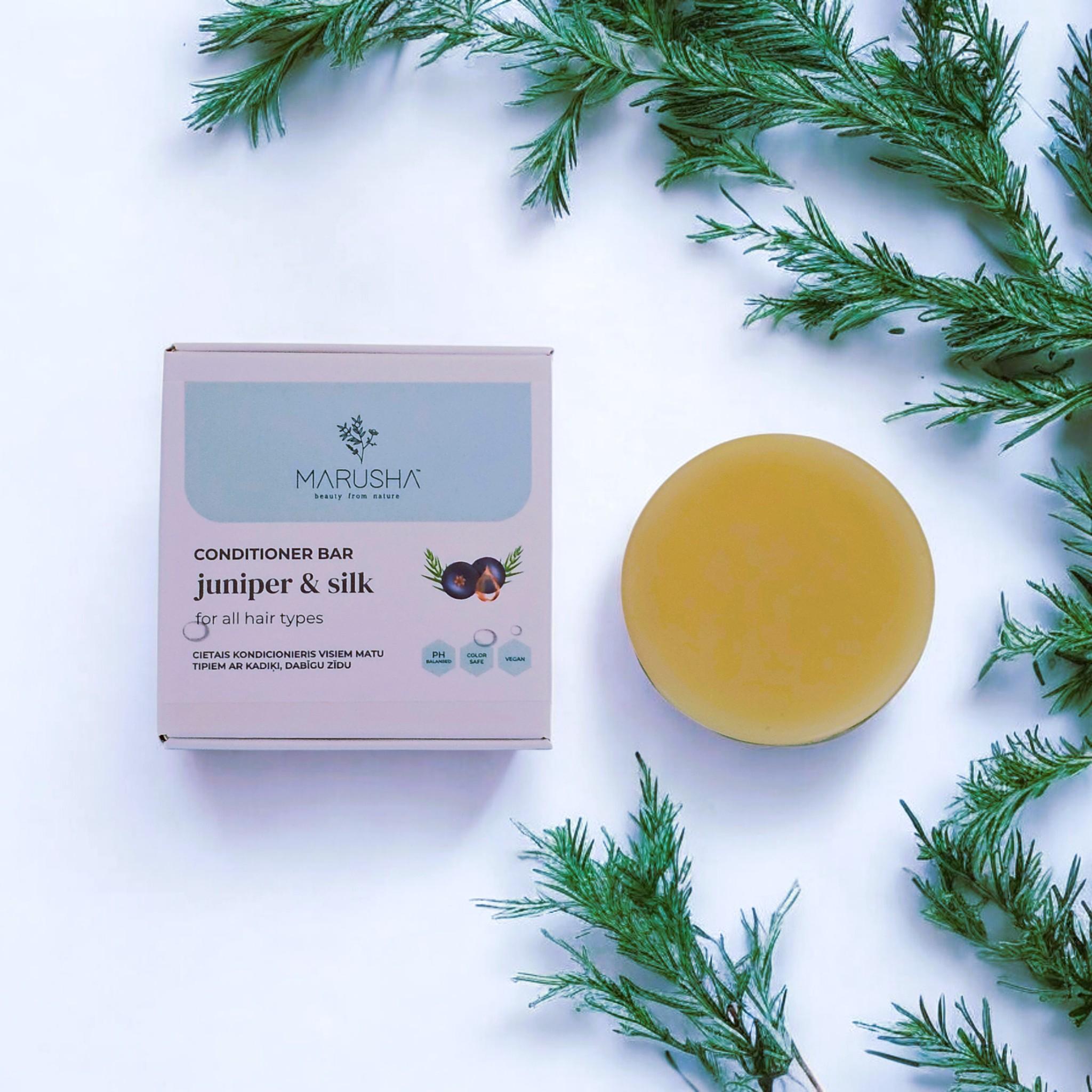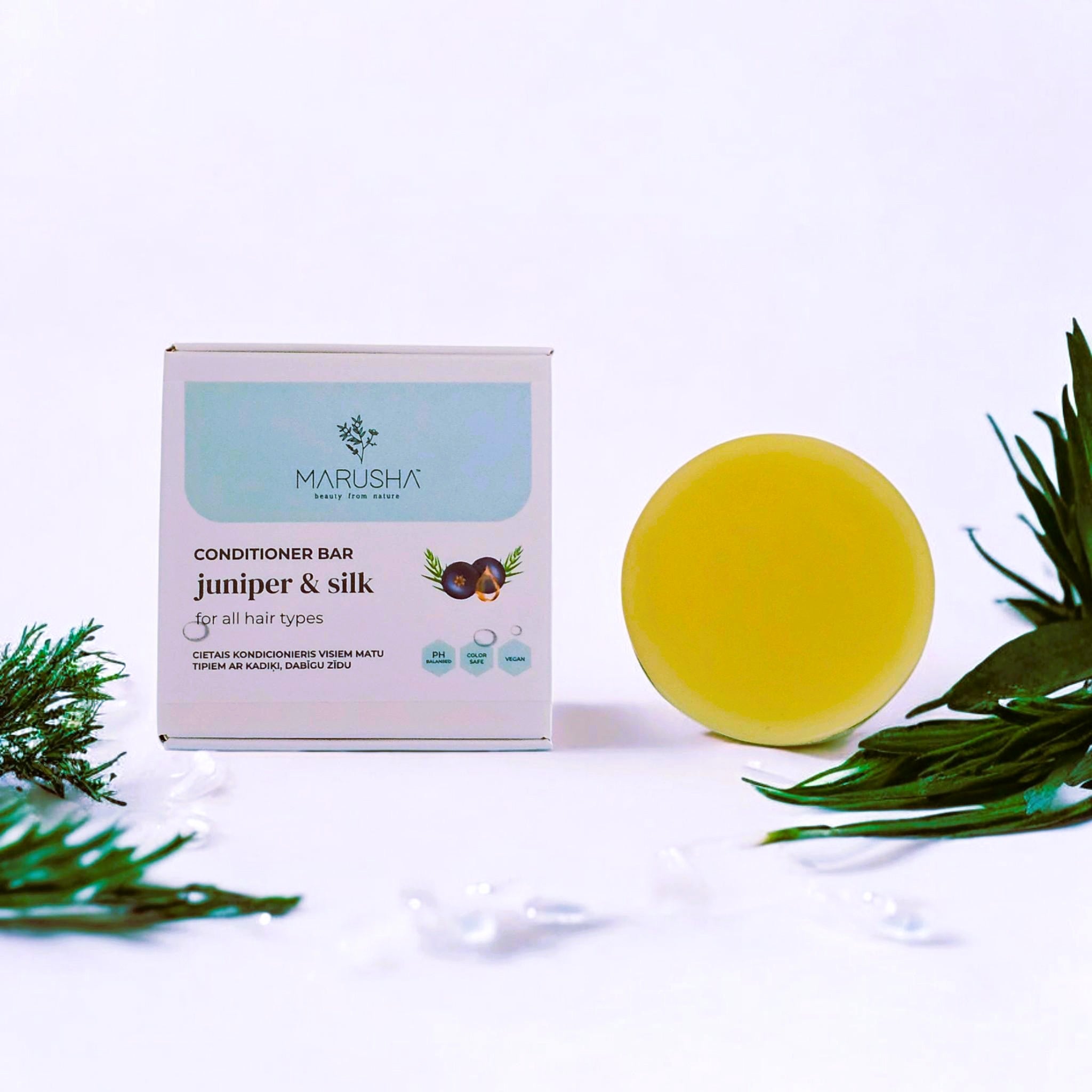 Conditioner bar contains Latvian juniper macerate in highly pressed olive oil, Rosemary and Neem oils, Natural Silk, Cacao and Shea butters, Panthenol. It can be used also as a hair mask.