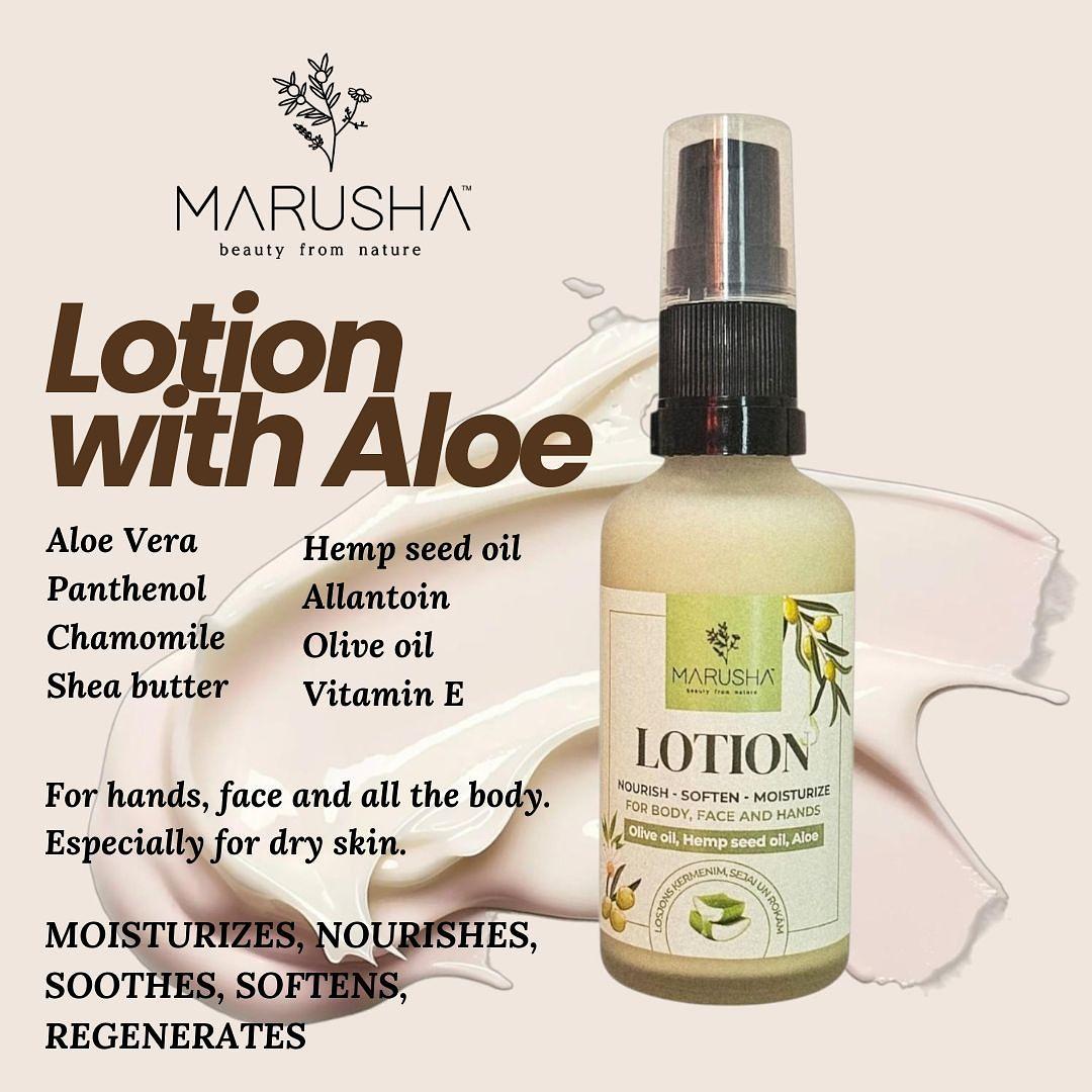 Moistorizing and nourishing natural lotion for face, hands and body care for all seasons with plant-based ingredients - Aloe water, Chamomile extract, Shea butter, Hemp seed oil etc.