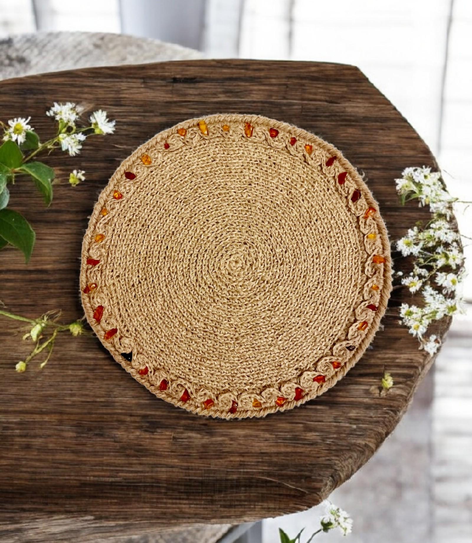 Linen crocheted tablecloth with natural amber stones. Handmade. Created in Latvia.