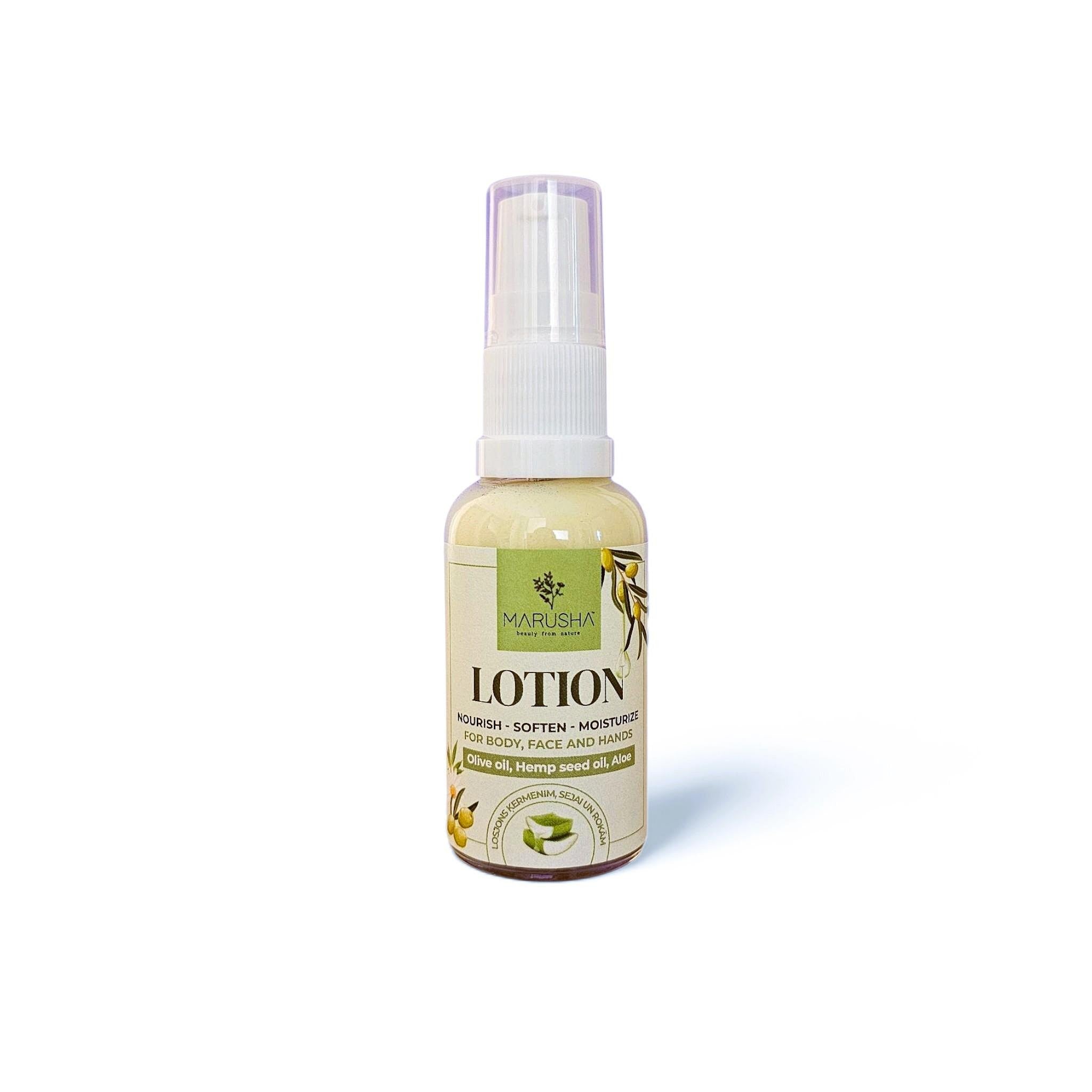 Lotion nourishes, moisturizes and softens skin with Aloe, Olive oil, Allantoin, Hemp seed oil, Chamomile and Bisabolol.