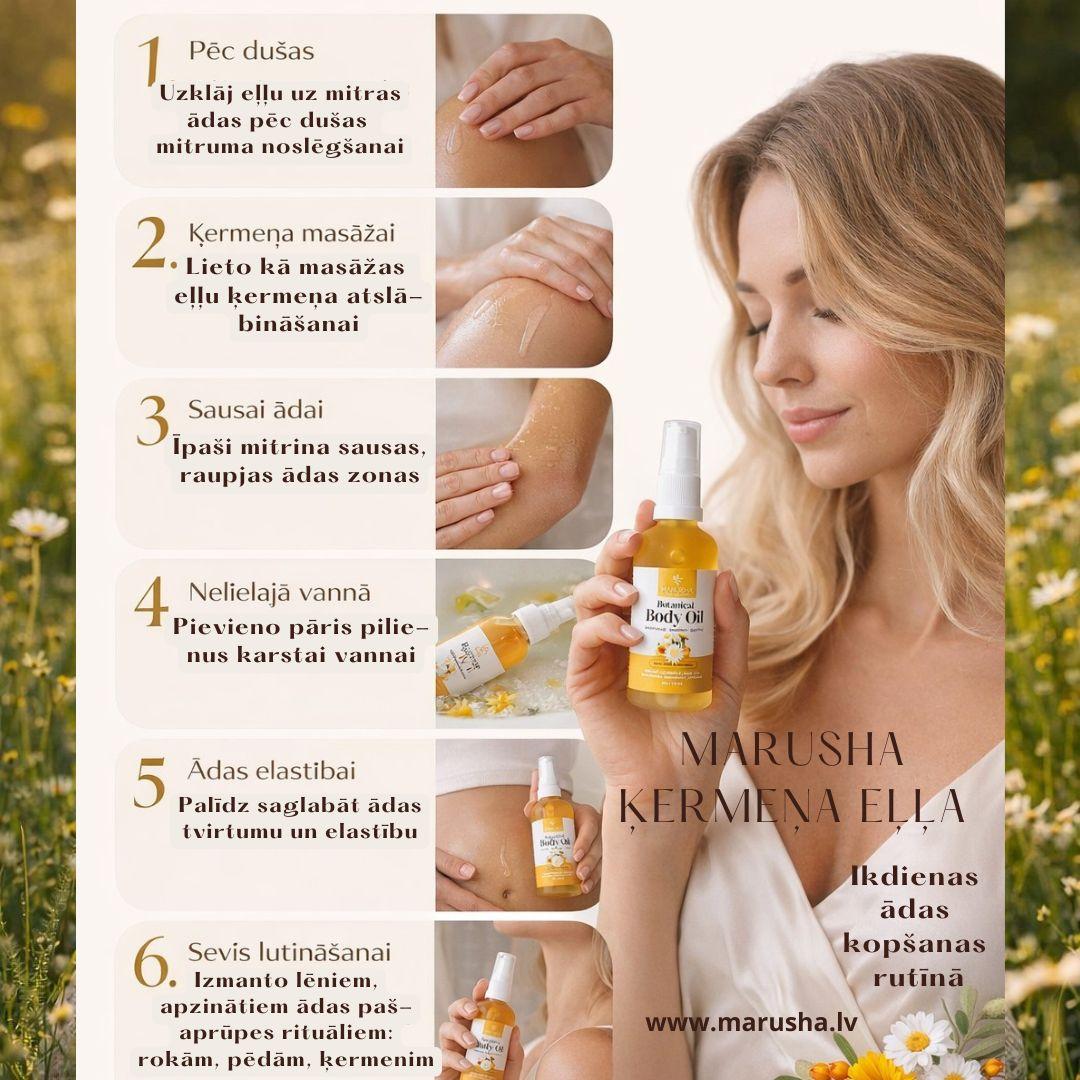 MARUSHA Ķermeņa eļļa sniedz ādai ne tikai mitrināšanas funkciju, bet arī holistisku ādas atjaunošanu, antioksidantu aizsardzību un ādas elastības uzlabošanu - jo tā satur daudz dažādu augu eļļu un ekstraktu kombināciju.