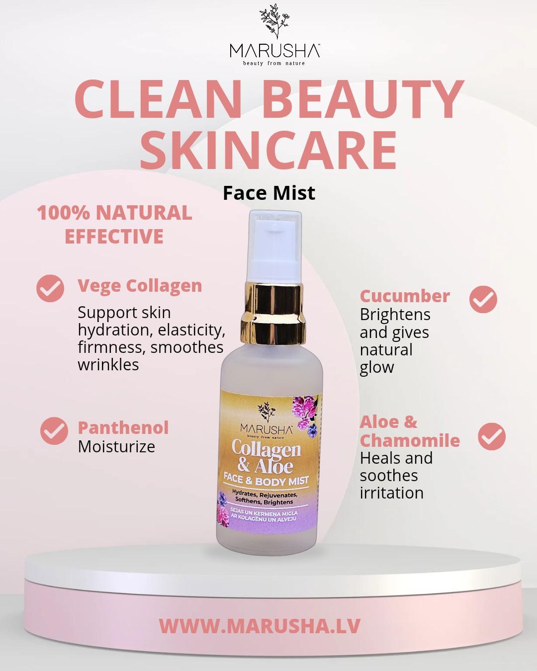 Mitrinoša un izlīdzinoša Sejas un ķermeņa migla ar Kolagēnu, Gurķu ekstraktu un Alveju, kas piešķir ādai dabisku mirdzumu, svaigumu