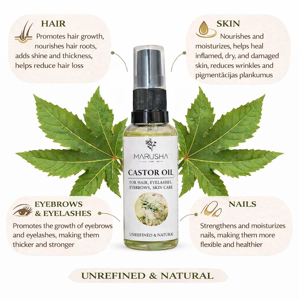 Dziļi mitrinošā rīcineļļa izveido aizsargbarjeru, stiprina un veicina veselīgu, biezu nagu, matu un skropstu augšanu, nodrošinot intensīvu kopšanu un barošanu.