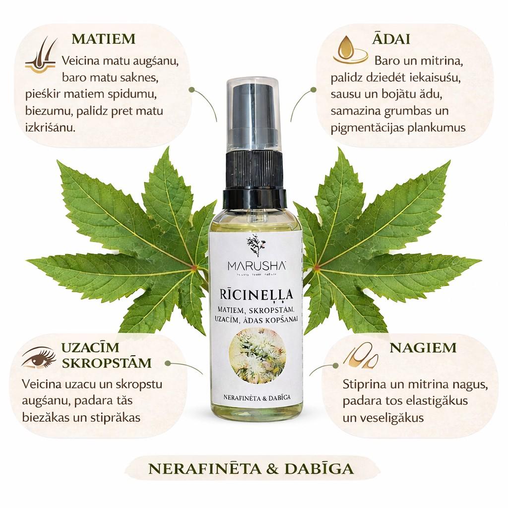 Organiska rīcineļļa ādai, matiem, nagiem un skropstām.