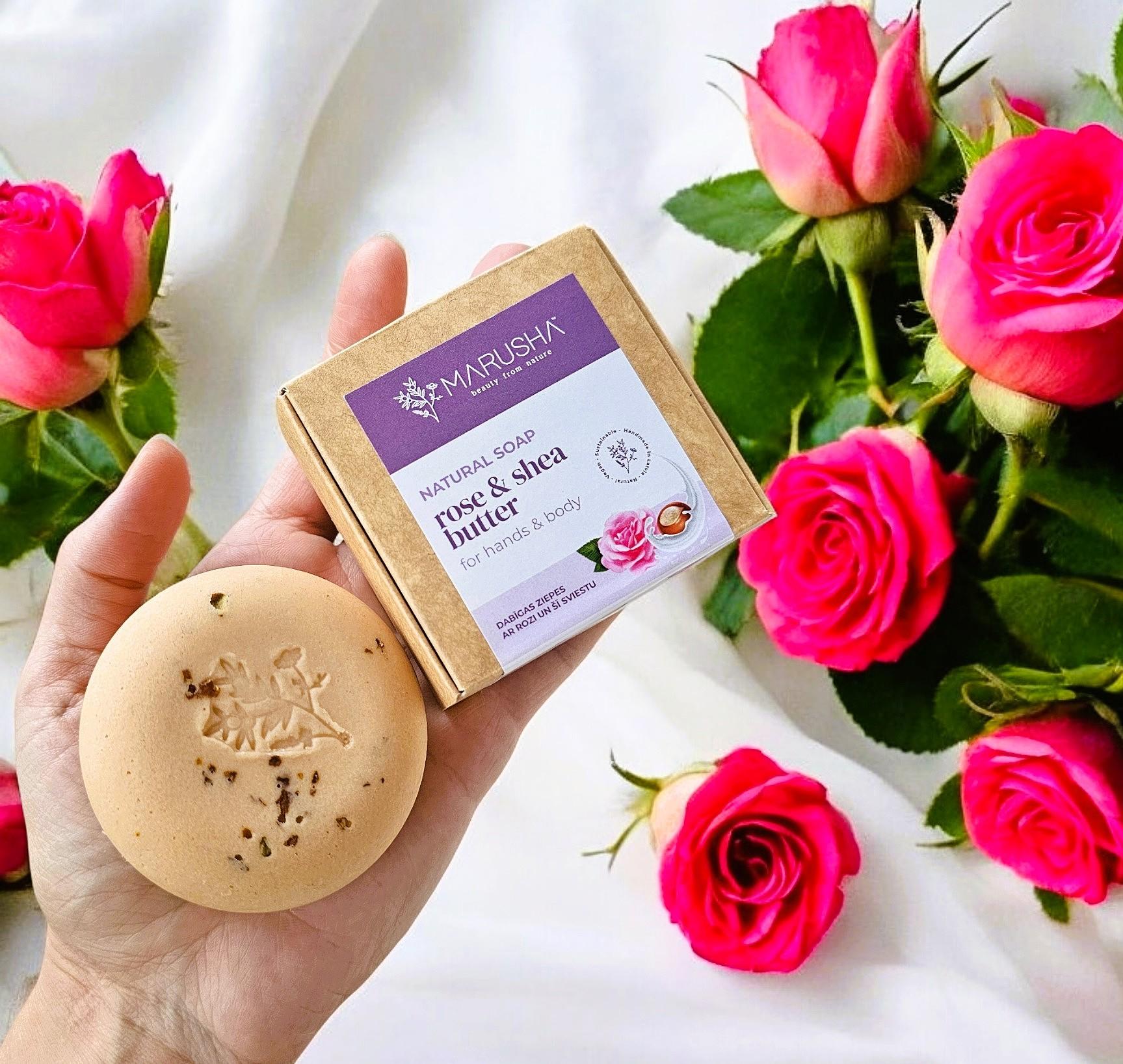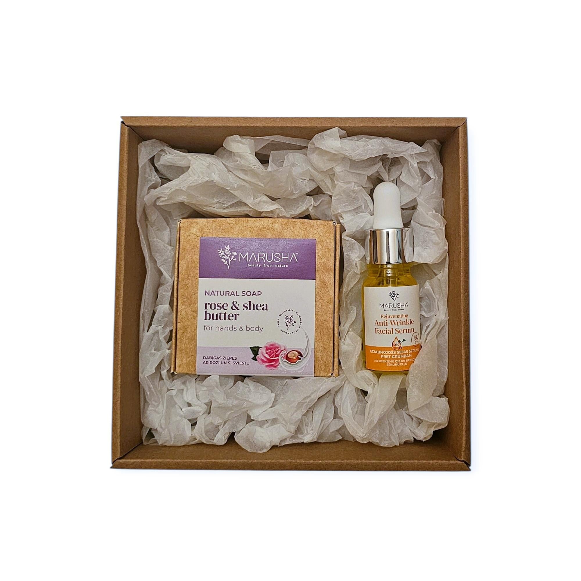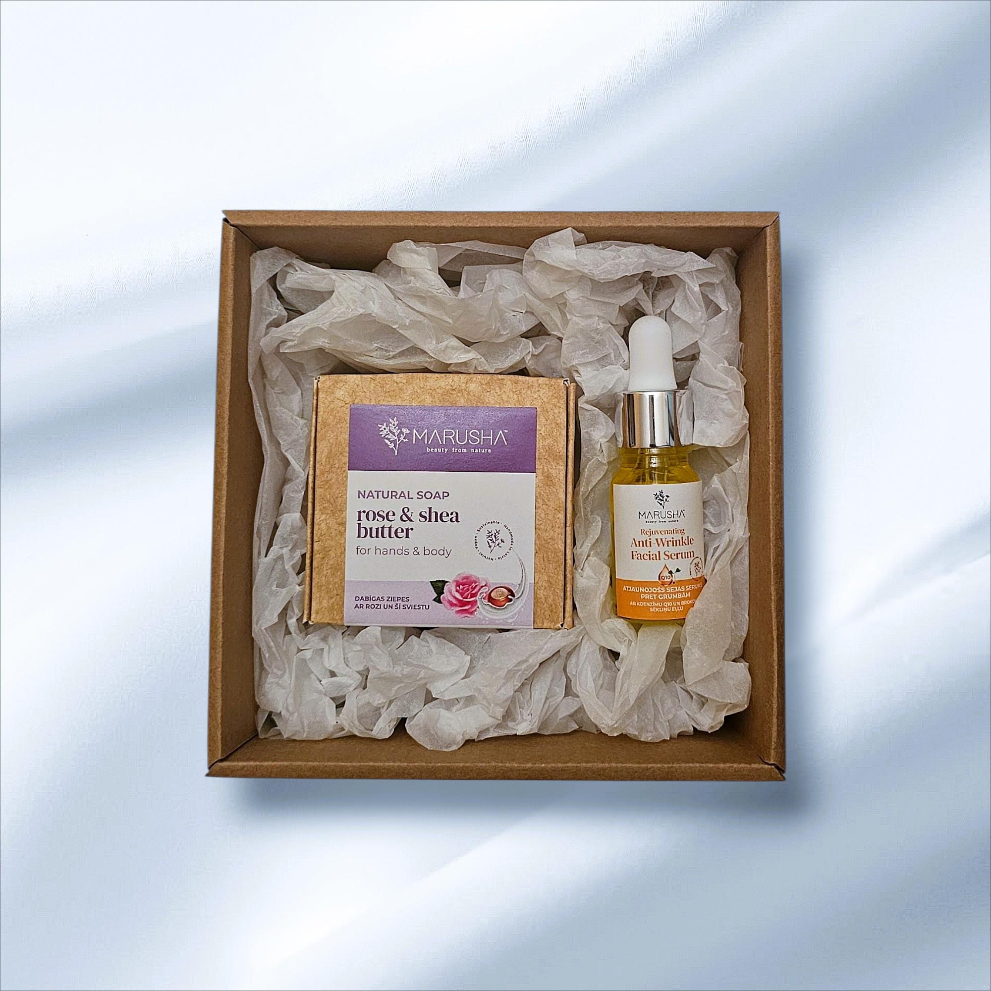 MARUSHA Dabīgs Dāvanu komplekts sievietei - Sejas serums pret grumbām ar CoQ10 un Dabīgas Rozes ziepes.